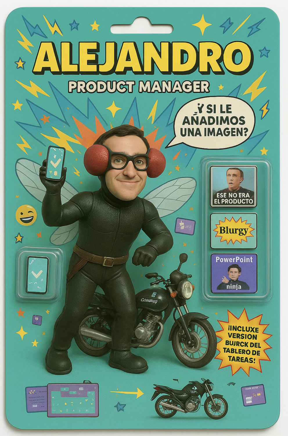 Aquí aproveché la fiebre de ChatGPT de "crear tu propio muñeco" y lo llevé al equipo con nuestros memes internos. Preparé una cara delantera y una trasera, las imprimí a doble cara en cartón y monté cada pieza como si fuera un juguete de blister.